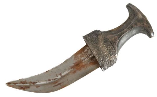 Condition: The silver is heavily tarnished, dented and worn. The blade has rusted. Knocks to the horn hilt.