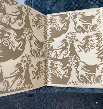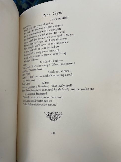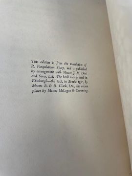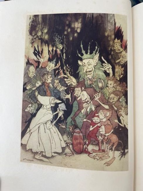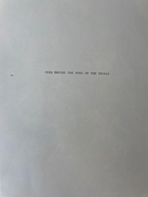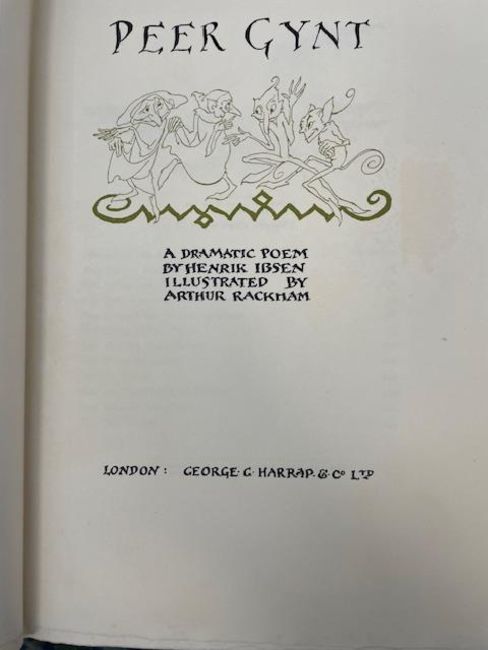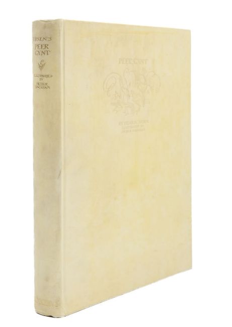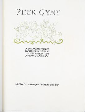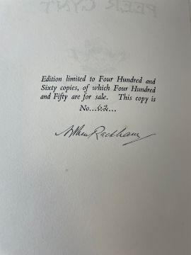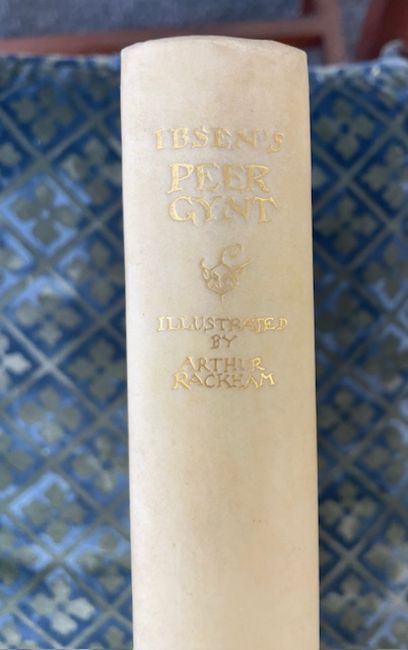 Rackham (Arthur, illustrator) & Ibsen (Henrik), 'Peer Gynt.'London: George G. Harrap & Co Ltd, 1936.First Rackham edition, deluxe limited edition, signed and numbered by Rackham (ink), no. 62 of 450 for sale. 10 other copies made. Total copies: 460.4to, original vellum, gilt lettering and decoration to front cover and spine, top edge gilt others deckled, pictorial endpapers, colour frontispiece 'Peer Before The King Of The Trolls' and 11 other colour plates with captioned tissue guards, pp. 255, [1], [1 - This edition is from the translation of R. Farquharson Sharp...]. This book comes with publisher's card slip case with hand numbered label to spine.27 x 24cm. Provenance. From a Private Collection of children’s illustrated books formed over the past fifty years. Condition: Good, minor surface marks to endpapers, text block / pages & illustrations generally clean.