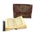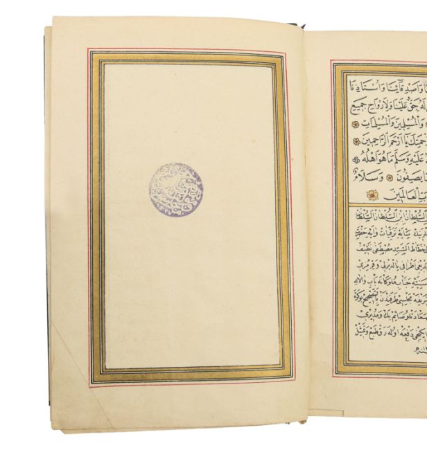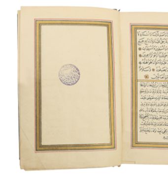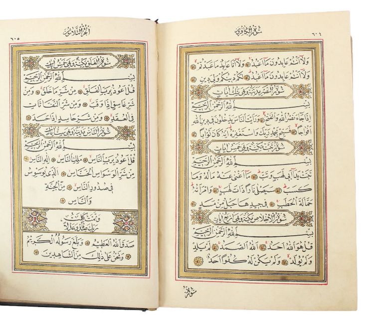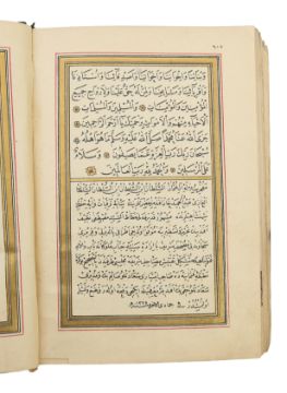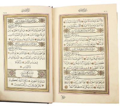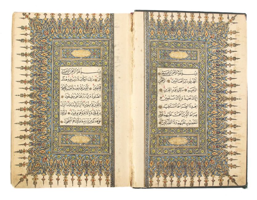 Arabic manuscript, written in an elegant black ink script with gilt flower-head markers, fifteen lines to a page, inner margin s ruled in back and gilt, headings and numbered. illuminated devices to outer margins, double illuminated frontispieces in black, blue and gold, in plain cloth binding with flap-over; together with elaborate heavily embroidered velvet bag (2)