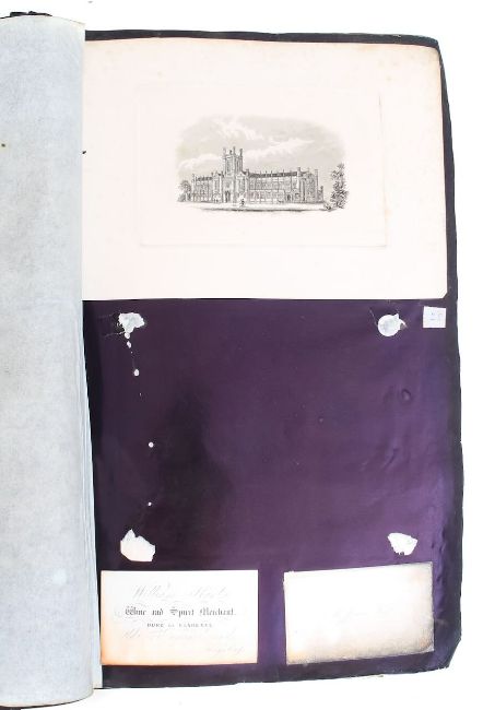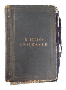 black morocco, gilt tooling to boards and spine, 'R. Hood Engraver' to front cover, marbled boards, mainly tipped-in engravings of rural, architectural & company trade labels / credit notes / logos / business cards.