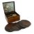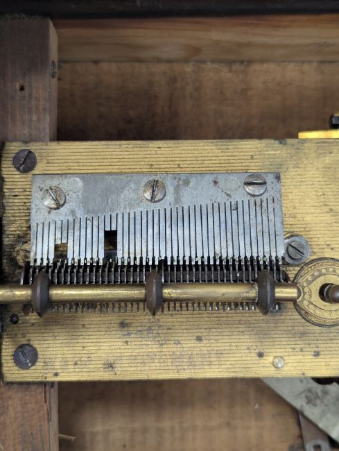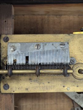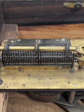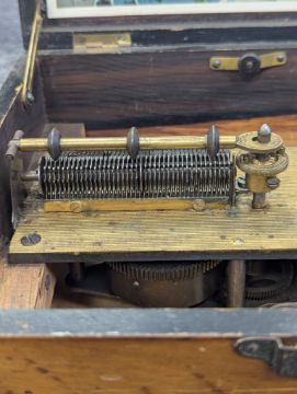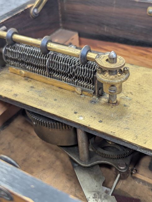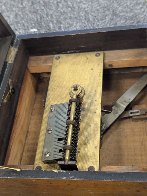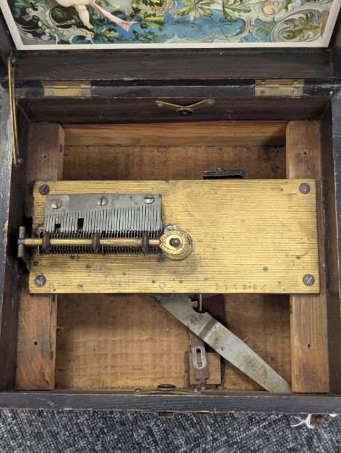 playing on a metal comb, with ratchet start/stop lever and securing bar, mahogany case inlay to lid, with print of putti playing instruments to interior lid, with a quantity of metal discs (