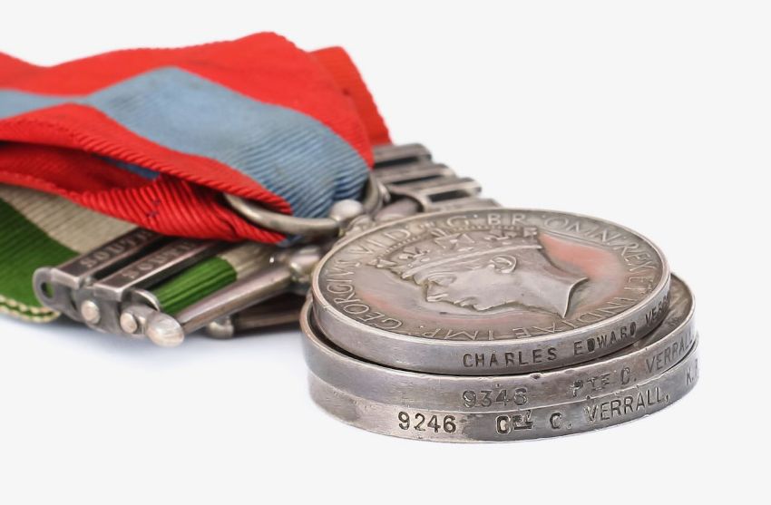 the Queen's South Africa named to 9246 Private Charles Verrall, K.R.R.C, with five bars for Diamond Hill, Johannesburg, Driefontein, Paardeberg, and Relief of Kimberly, the King's South Africa named to 9346 Corporal Charles Verrall, with two bars for South Africa 1901 and 1902, and the Imperial Service Medal, named to Charles Edward Verrall (3)
