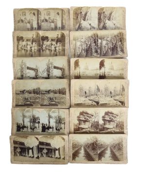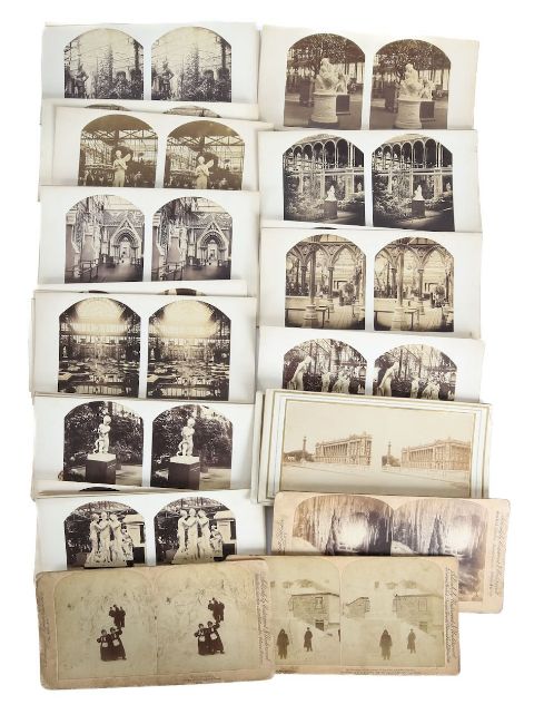 the painted viewer decorated with carved floral decoration together with a large quantity of cards some published by Underwood and Underwood, scenes include Broadway, New York; Pyramids; Egypt, Versailles France; Presidents Mansion Washington; scenes of Forth Bridge; Base at the foot of the Fujiyama, Japan etc etc...(qty)