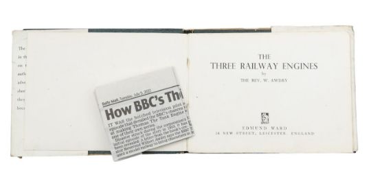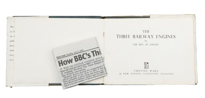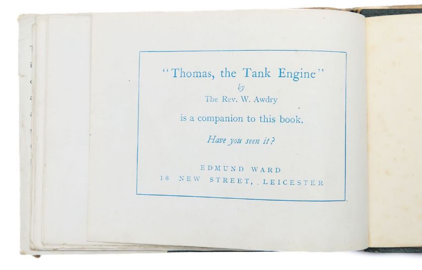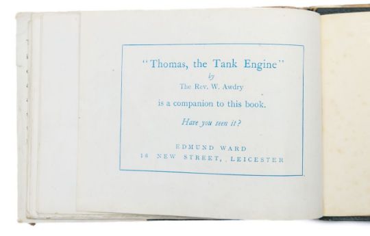 Awdry (Rev. W), 'The Three Railway Engines.'Leicester: Edmund Ward, c.1946.First edition, second or third printing (with "Thomas, the Tank Engine" advertisement to back / last leaf). 16mo, oblong, hardback with dust jacket, green leather with gilt tooling to front board. pp. 62 (inc. 28 colour plate illustrations by William Middleton), [1: advert as stated above].11 x 14.5cm.Condition: Provenance. From a Private Collection of children’s illustrated books formed over the past fifty years.