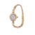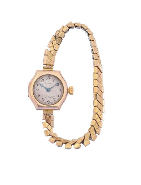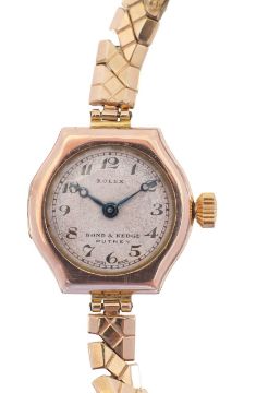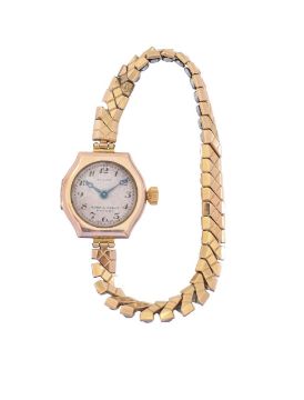 the shaped silvered dial with Arabic numerals, and moon shaped hands in a 9ct gold case, retailed by Bond and Kedge Putney, on expandable base metal strap, with presentation inscription to reverse of case