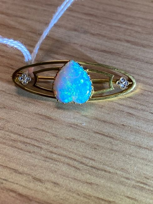 with 14ct stamp, central heart shape opal cabochon with beautiful play of colour, claw set to an oval open wire work mount with rose cut diamond set flowers brooch pin to rev