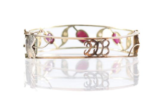 with no visible hallmarks, featuring an open wire work hinged bangle set with four oval ruby cabochons and split pearls, a pair of opal oval cabochon ear rings with leaf design and ruby detail and a novelty emu brooch set with oval cabochon opal (3)
