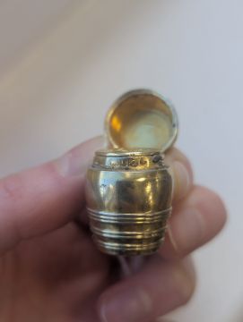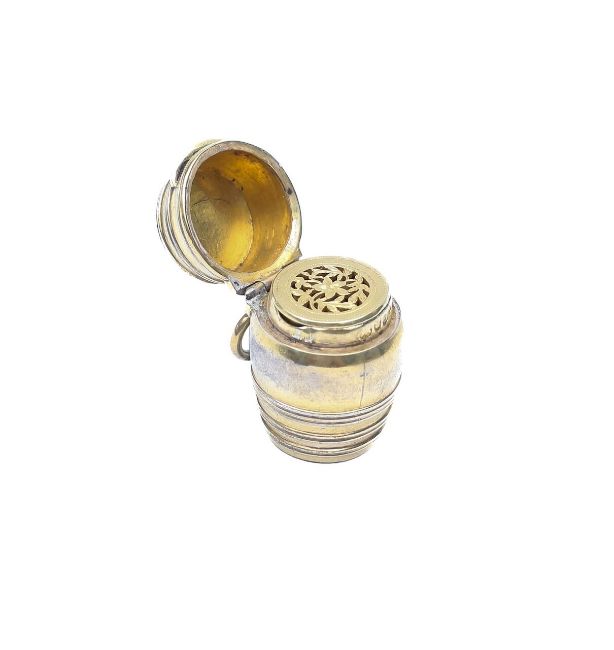 London possibly 1819, modelled as a barrel, with suspension ring loop, hinged lid, and pierced floral grille