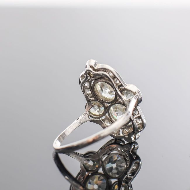 A diamond rectangular panel ringan old brilliant-cut diamond collet to each of the cardinal point to the diamond-set cusped and scroll surround and plain tapering shank, ring size P, length 22.4mm, width 15.3mm, 5.6gCondition: A stylish ring in good condition. two cushion-shaped diamonds each spread 1ct/1.20ct, (collets 6.6mm x 6.7mm x 3.2mm; and 6.3mm x 6.2mm x 3.2mm)Remaining two principal diamonds spread +/-0.60-0.70ctst