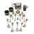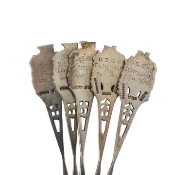 comprising a mustard pot, by Goldsmiths & Silversmiths, London 1928, of octagonal form, with engraved initials 'L.U.H', two napkin rings, Birmingham 1927, and London 1897, a cut glass cup, with a silver holder, and various spoons comprising a set of six gilt coffee spoons, five teaspoons of golfing interest, and a jam spoon (qty.)