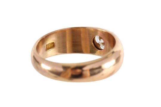 featuring a brilliant cut diamond centrally set to a raised four claw setting mounted to a high domed 'D' shaped tapered band, indistinct mark rose colour metal