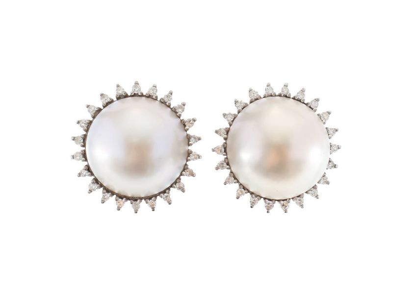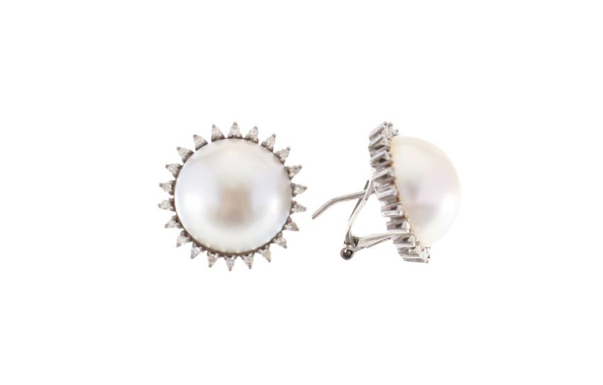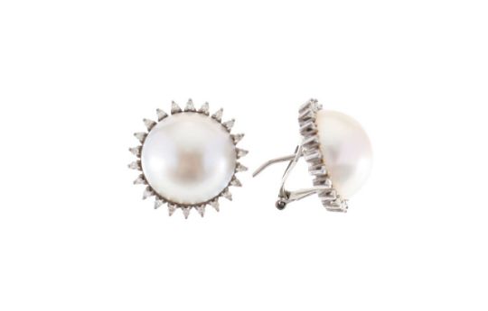 with no visible marks, a centrally claw set mabe pearl with a surround of single cut diamonds with a peg and lever fixing