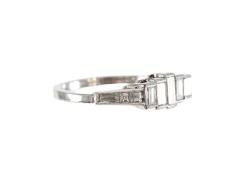 with platinum London hallmark, five baguette diamonds graduated, set flat across the finger, mounted to a wire work collet fanning out from a single round brilliant cut diamond and raised diamond set shoulders each with two carré cut diamonds and a tapered baguette to finish,