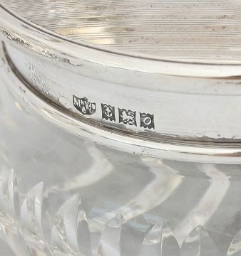 the Victorian claret jug by Hukin & Heath, Birmingham 1891, the collar with an engraved eagle crest to a foliate cartouche, and hobnail cut glass body, the dressing table jar by Mappin & Webb, Birmingham 1936, with engraved initials 'CK' and engine-turned decoration, and a pair of candlesticks, Birmingham 1964, with reeded decoration, knopped stems and loaded bases (4)