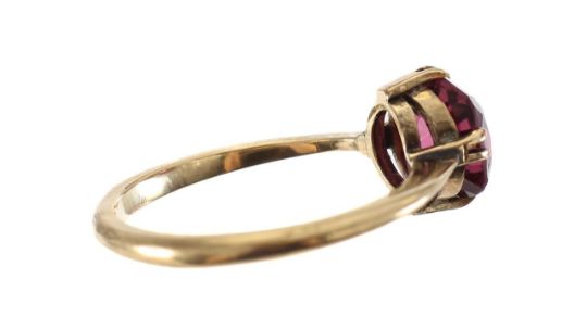 with 9ct stamp, single cushion cut garnet set in four claws 'north south' with galleried collet and a plain knife edge mount