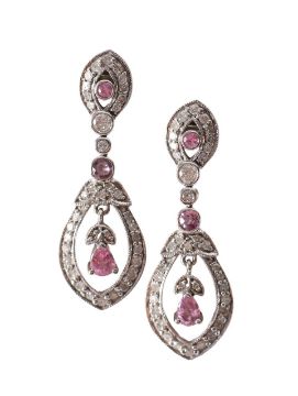 with 18ct hallmark, a bezel set oval modern cut tourmaline, suspension loop and diamond bail, a pair of Edwardian style pink sapphire drop ear pendants with 18ct stamp and peg and scroll fixings together with 18ct hallmark, cabochon onyx with diamond set leaf motif suspension loop set with two black diamonds, peg and scroll fixings (3)