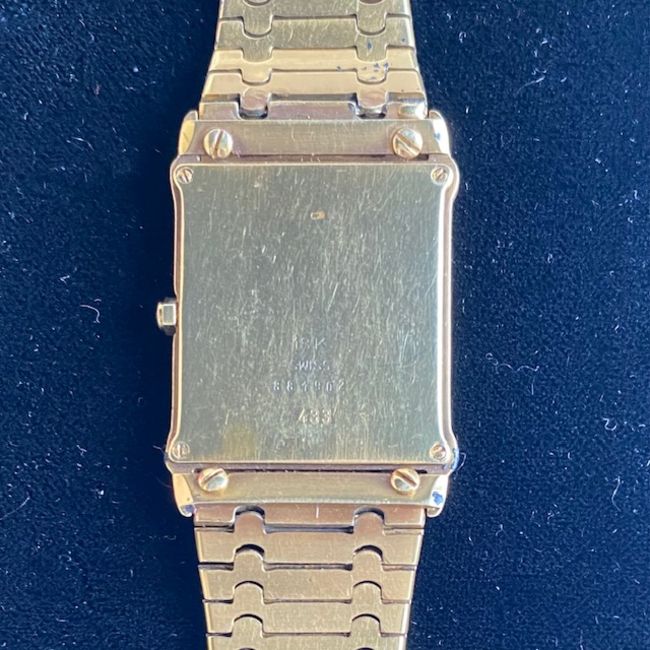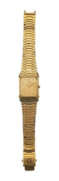 the rectangular gold coloured dial with raised baton numerals, articulated bracelet, engraved on reverse of case 18K with pouch and papers serial number (49881902-2)