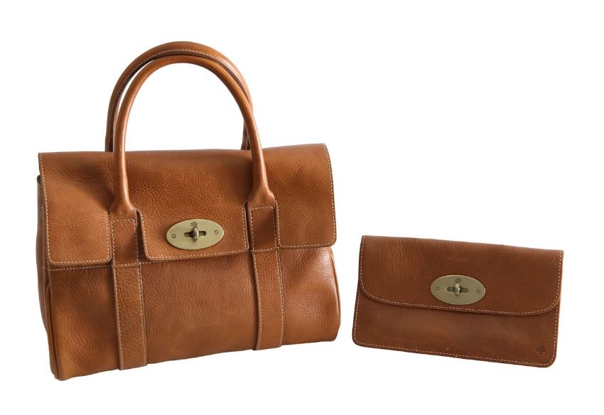 A Mulberry 'Bayswater' oak leather handbag and a long locked pursewith rolled handles, gold tone hardware and postman's lock, the interior with adjustable belted sides, stamped 'Mulberry', with gold tone pendant, serial no. 019435, the purse impressed 'Mulberry', with a gold tone postman's lock, opening to reveal six card compartments, a note pocket, and zipped coin pouch (2)the handbag width 26cm, depth 14.5cm, height excluding straps 21cmthe purse width 19cm, height 10cmCondition: No dust bag present. Minor wear to the leather. Useable.