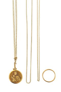 A 22ct gold band, a medallion chain and two further chains