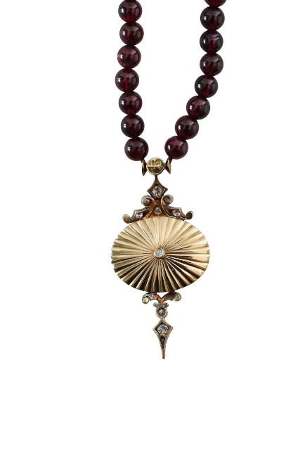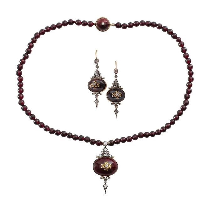 Victorian revival garnet necklace featuring a deep red oval cabochon garnet, centrally set with a round brilliant cut diamond, mounted on a closed back textured setting with diamond set open scroll work beneath and above the centre stone, suspended from a round garnet bead strung necklace, the clasp is reflective of the pendant with a round garnet cabochon, centrally set diamond and closed back textured setting with box clasp and 18ct stamp with this are matching ear pendants with shepherds crook fittings, the ear rings are nicely weighted and hang well, all pieces are set with a single diamond to a classical textured gold reverse (2)
