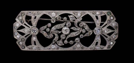 rectangle galleried metal work with an array of old cut diamonds, ornate open work floral pattern with milgrain detailing set around three feature diamonds, with brooch pin and safety chain fixing