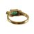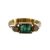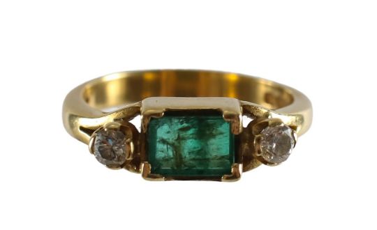 with 18ct hallmarks, rectangle cut emerald stone set across the finger with round brilliant cut diamonds claw set to either side, split tapering 'D' shape band