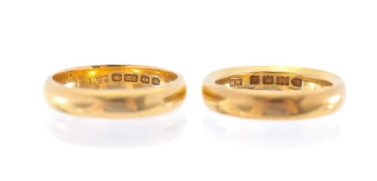 Two 22ct gold band rings,London 1897, court shape, and Birmingham 1925, D shape (2)Birmingham ring size O 1/2 London ring size L 1/2total weight 14.4 gramsCondition: Light surface scratches.