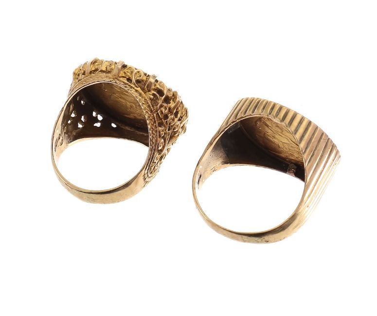 both 1900 sovereigns with St George and the dragon, and Victoria profile facing left, one claw set to a foliate openwork shank, the other with a reeded shank, marked 9ct (2)