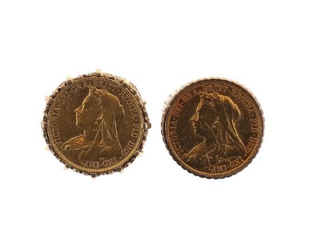 Two Victorian gold full sovereigns in 9ct gold mounts