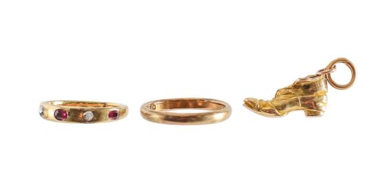 with oval rubies and rose cut diamonds set to a plain tapered band, a 9ct hallmark. plain band and a 10k stamp old boot charm with suspension loop (3)