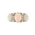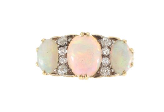 with 18ct stamp, three oval cabochon opals mounted in a carved claw setting with eight old cut diamonds set between