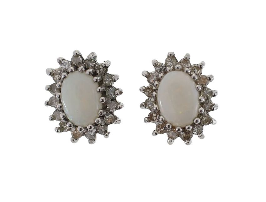 with 9ct hallmark, oval opal cabochon with single cut diamond halo with peg and scroll fittings