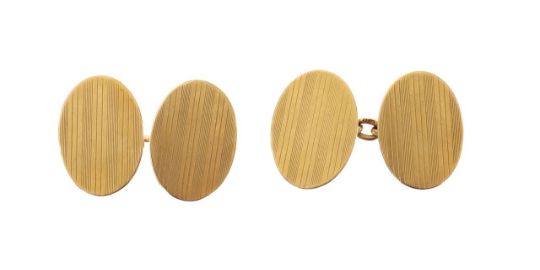 18ct gold Birmingham hallmark, of oval form, with vertical engine-turned decoration, and chain links (2)