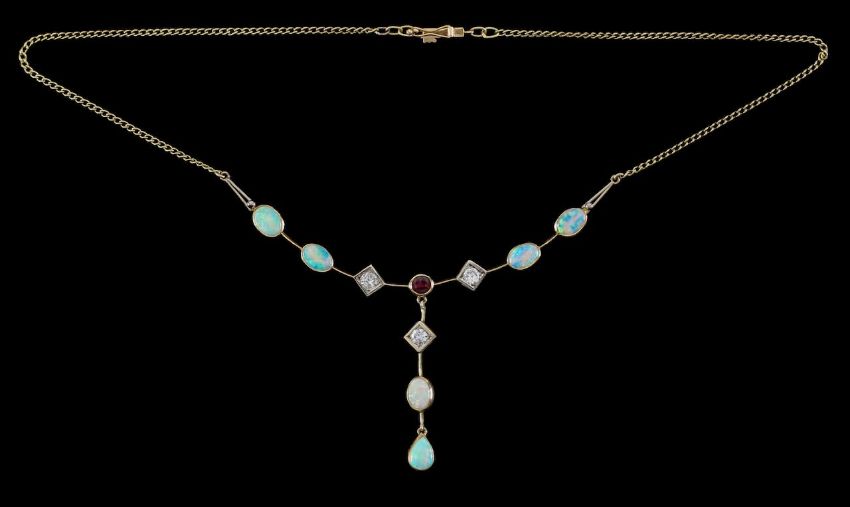 with 18ct stamp to clasp, multi gem set necklace mounted on wire with a ruby (untested) diamond opal articulated drop attached to a curb chain with snap clasp and figure eight safety catch