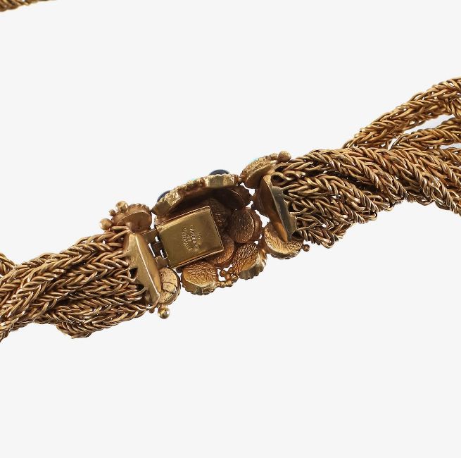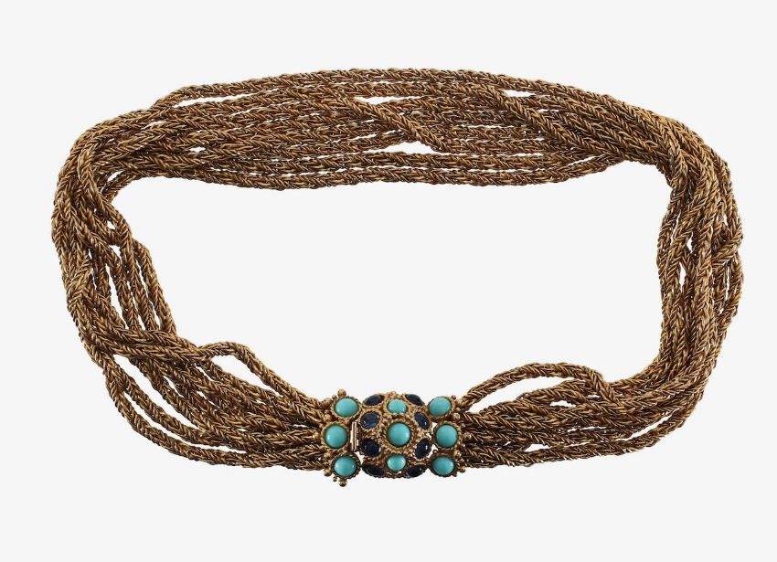 the multi strand twisted rope design with navy and turquoise blue cabochon glass clasp, stamped on the reverse Chr Dior 1967 Germany