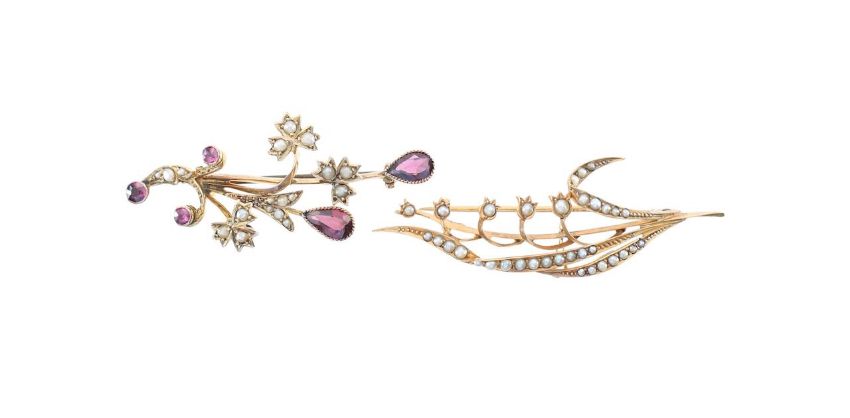 comprising a floral spray example with 9ct stamp to reverse, two pear drop garnets seed pearl set leaf motif, three round purple stones and a safety chain, together with a 9ct stamped, snow drop brooch design, with seed pearl set leaves and flowers with safety chain (2)