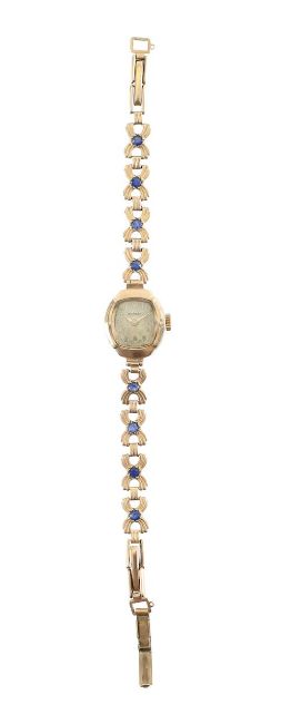 the dial with Arabic raised gilt numerals, expandable bracelet set with synthetic sapphires