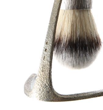 A Christopher Nigel Lawrence silver shaving brush and standLondon 1976, for Kent of London, with a badger hair brush, mounted on a curved stand, in a typical textured finish the brush height 11cmthe stand width 8.5cm, depth 6cm, height 9cm, weight 2oztCondition: No significant losses to the badger hair. Tarnishing to the stand. No dents.