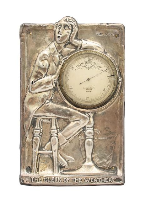 the silver plaque by M & C Lister Ltd, Birmingham 1909, decorated a seated gentleman, 'The Clerk of the Weather', leaning on a globe inset with a brass barometer, inscribed 'Victor E. Smyth, Optician, Dublin', registered design no. 839682