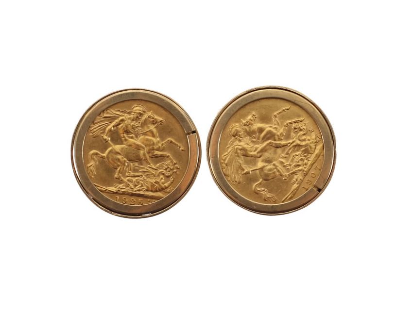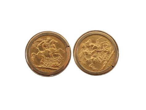 An Edward VII and George V gold full sovereign pair of cufflinks, in 9ct gold mounts