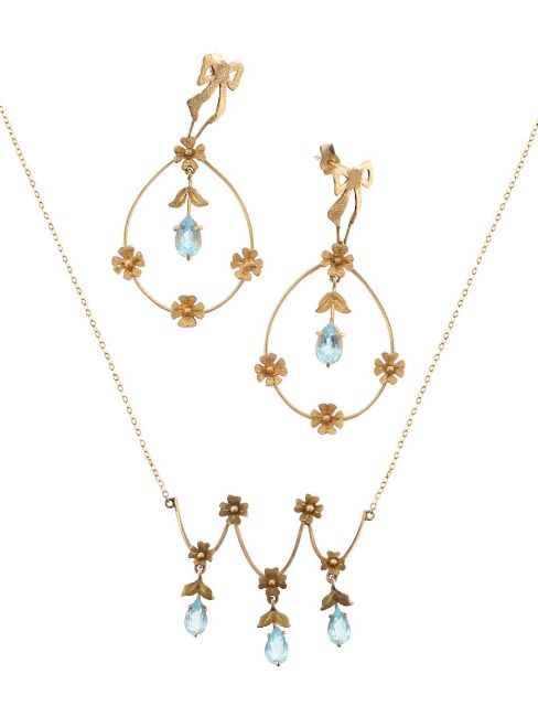 with no visible mark, decorative floral hoop, blue faceted drop centrally suspended from textured bow with peg and scroll fixing and a necklace made to match with three blue faceted drops suspended from a flower motif to three wire arches fixed to a flat trace chain with 9ct stamp to the clasp (2)