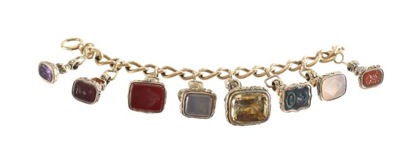 with 18ct stamp to each link, decorative fob seals (four gilt) with various engravings on hard stones, citrine and amethyst