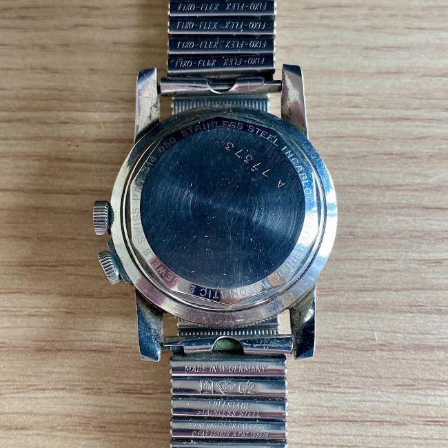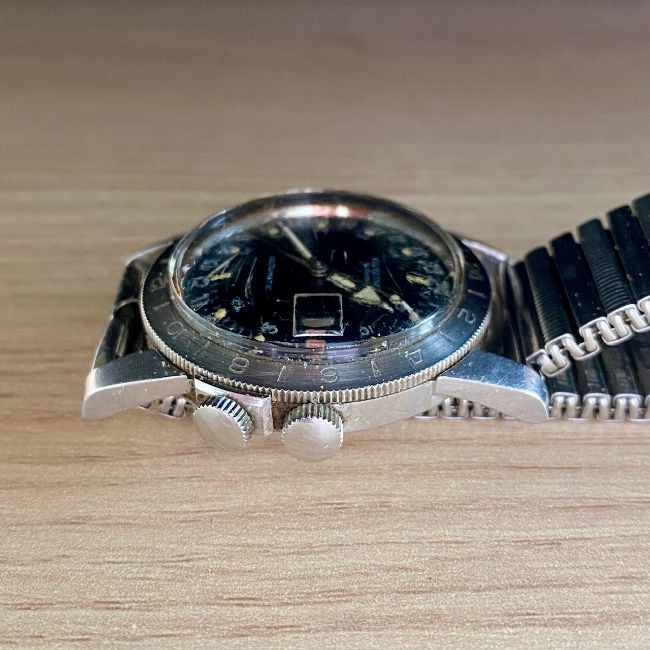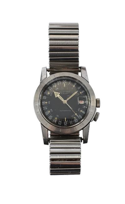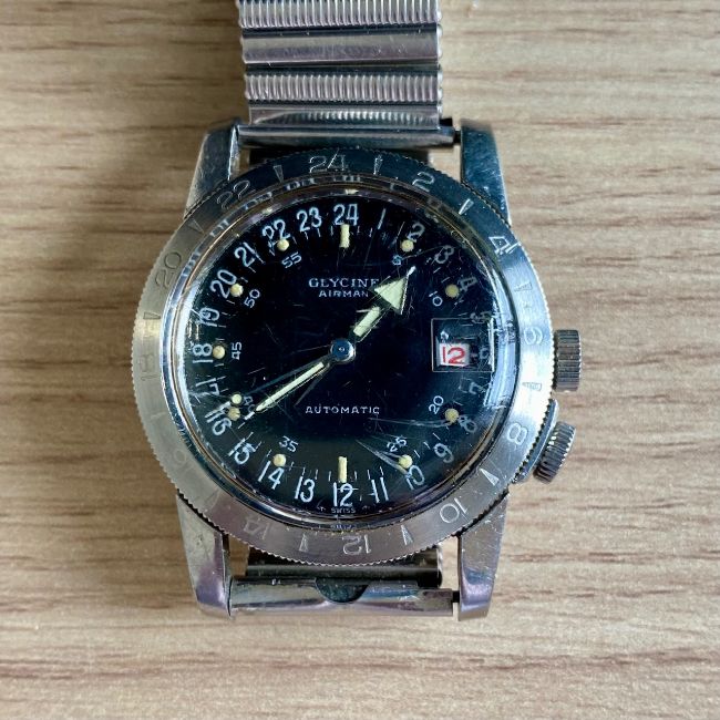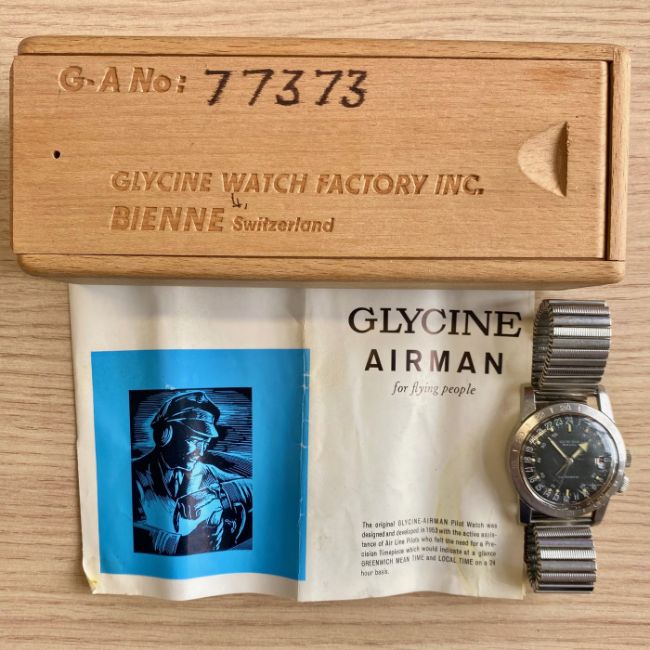 c.1960s, Swiss, 17J automatic movement, the signed black dial with white Arabic numerals, luminous hands and dot markets, magnified date aperture, and 24 hour rotating bezel for second time zone, G-A No. 77373, patent no. 314050, with its original box and paperwork, and later fixo-flex strap.