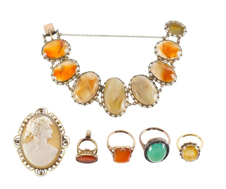 featuring a portrait of a classical lady facing right collet-set to decorative bead work boarder with brooch clasp and safety chain, an articulated bracelet with eight, oval, graduating hard stone, bezel set with loop and bead detail with matching hard stone ring, a rectangle hard stone ring and an oval green stone ring with faceted white paste set border and a seal fob set with cornelian (6)