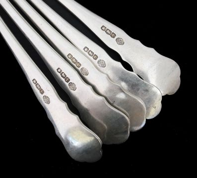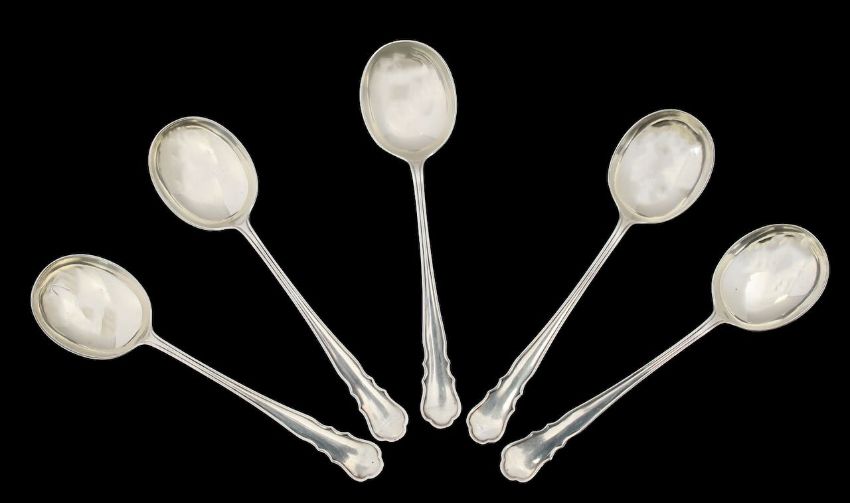 A set of six George IV silver Dubarry pattern soup spoons,