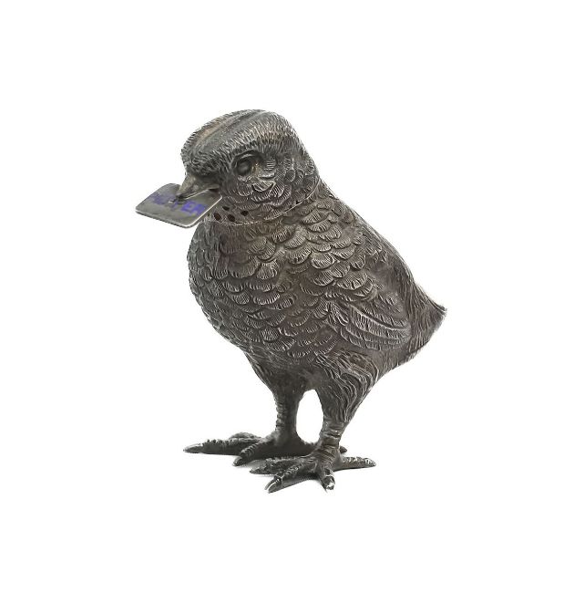 by William Thornhill & Co, London 1881, holding a letter in its mouth, inscribed 'PEPPER' in blue enamel, to a gilt interior