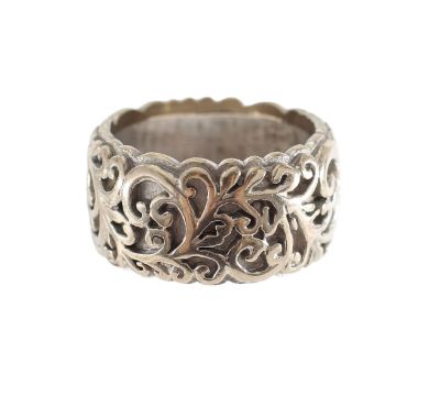 with hallmark 1971-72, ornately pierced scroll work design, wide 'D' shape profile band