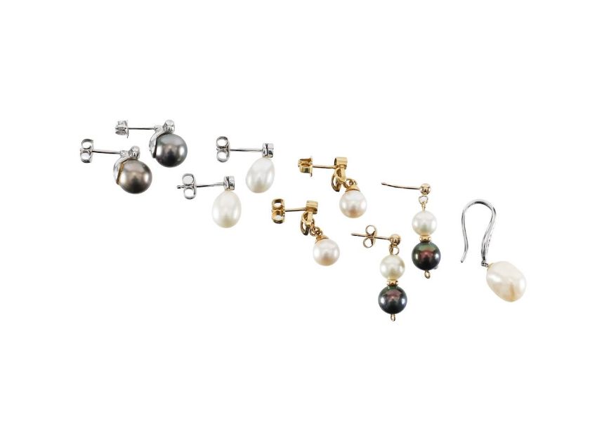 with 18ct hallmark, white pearl drop with a diamond stud, post and scroll fittings, a pair of black round pearls with diamond hat, 18ct hallmark, snow drop pearl and diamond ear rings with chain, post and scroll fittings, a two drop white and black pearl ear ring with gold bead detail, post and scroll fittings and a single baroque pearl with diamond set shepherds crook with 375 hallmark (5)