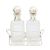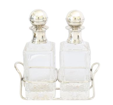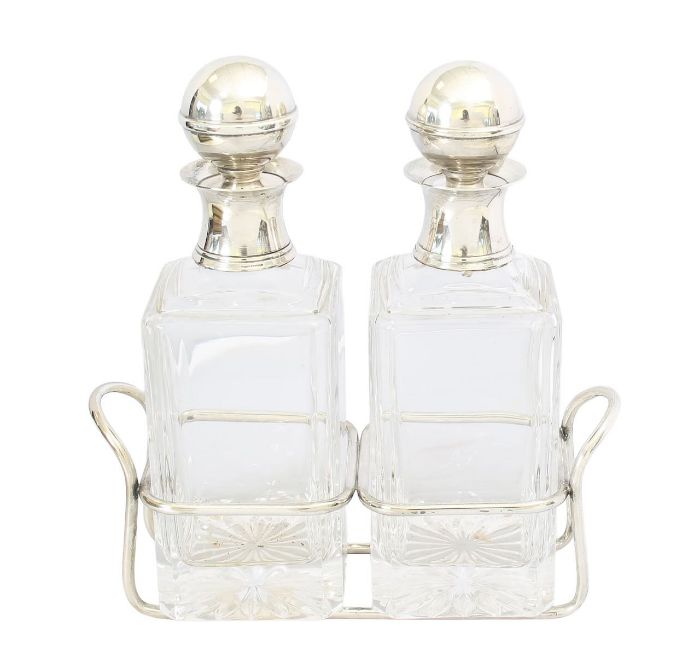 with silver-plated ball form stoppers and cuffs, to a rectangular glass body, with cut glass lemon squeezer base, on a stand