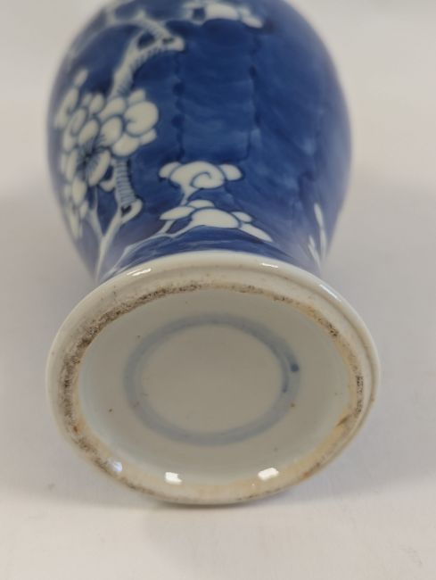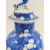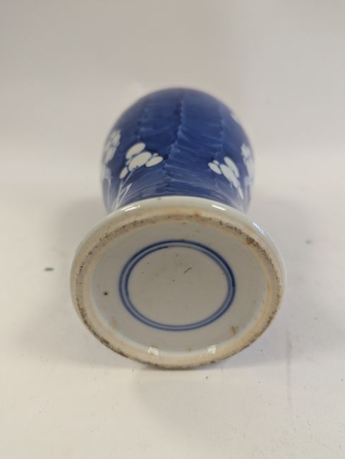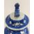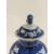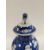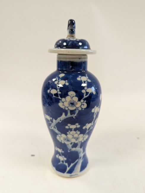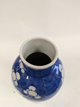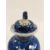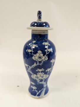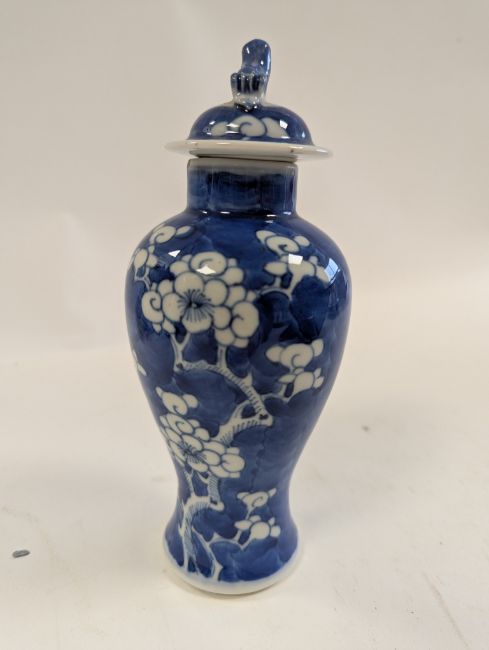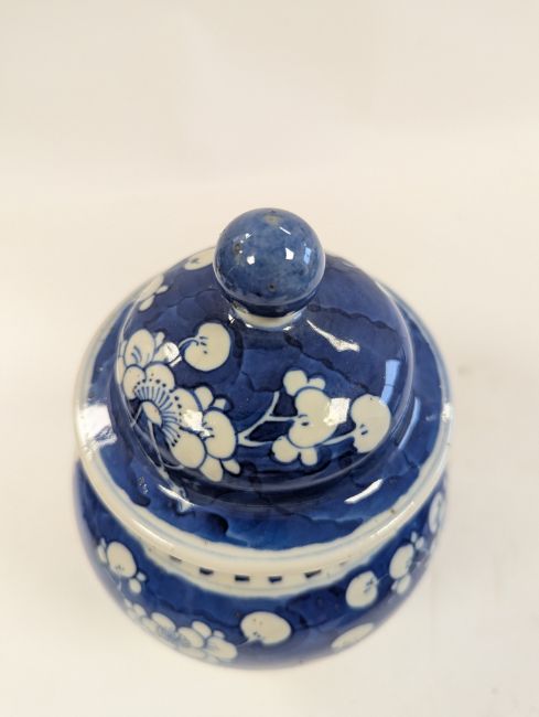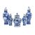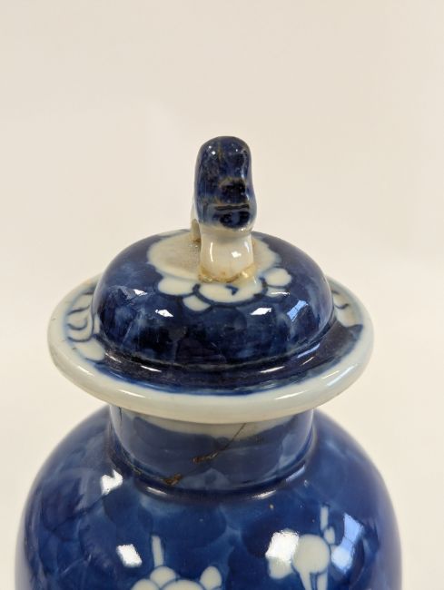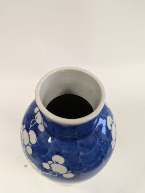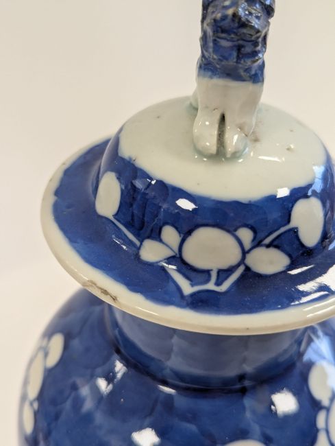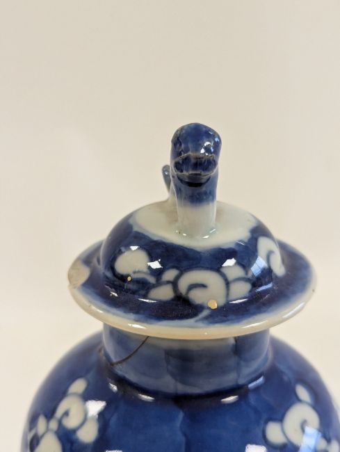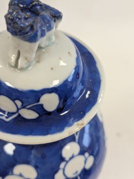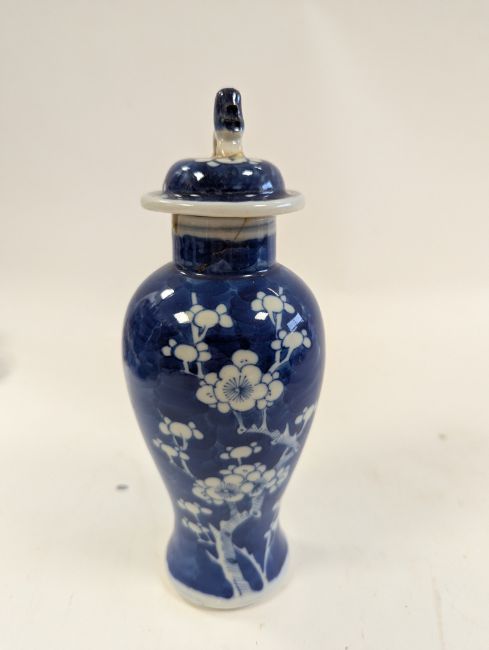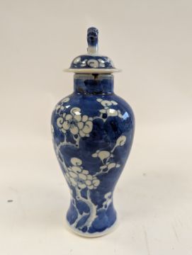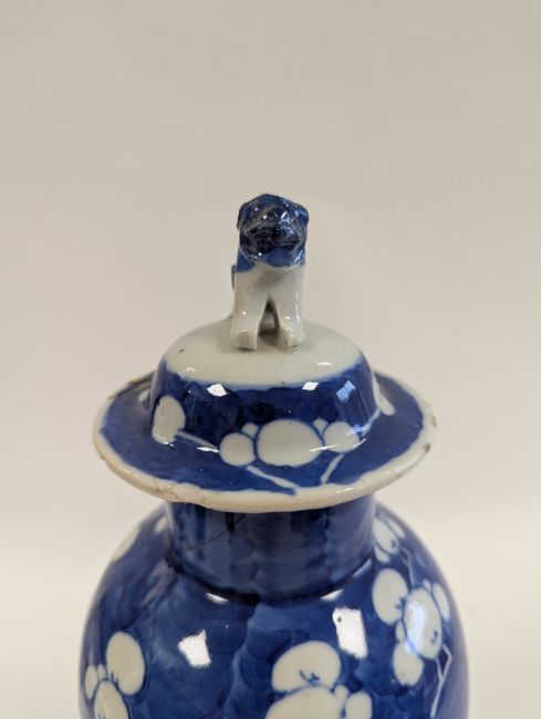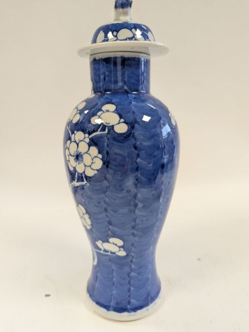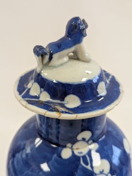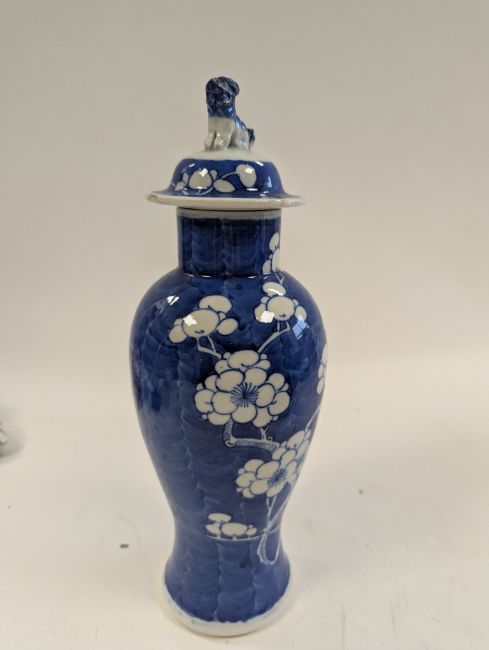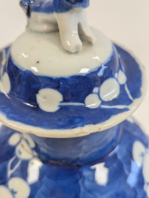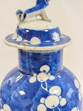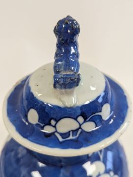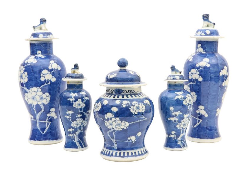 20th century, comprising a pair of large vases, of bulbous form, the covers surmounted by a fu dog, a similar smaller pair, and a ginger jar, with a Kangxi four character mark to the base, all decorated with prunus blossom to a blue ground (5)